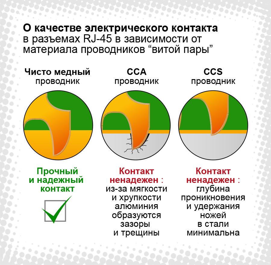 Алюминиевые проводники, имеющие структуру CCA, не выдерживают многократных изгибов и ломаются при небольших радиусах изгиба.При заделке в стандартный RJ-45 разъем CCA-проводник обжимается плохо и не может обеспечить надежного контакта, т.е. у потребителя сразу возникает риск появления "плавающего" (исчезающего) контакта уже в ближайшем будущем.